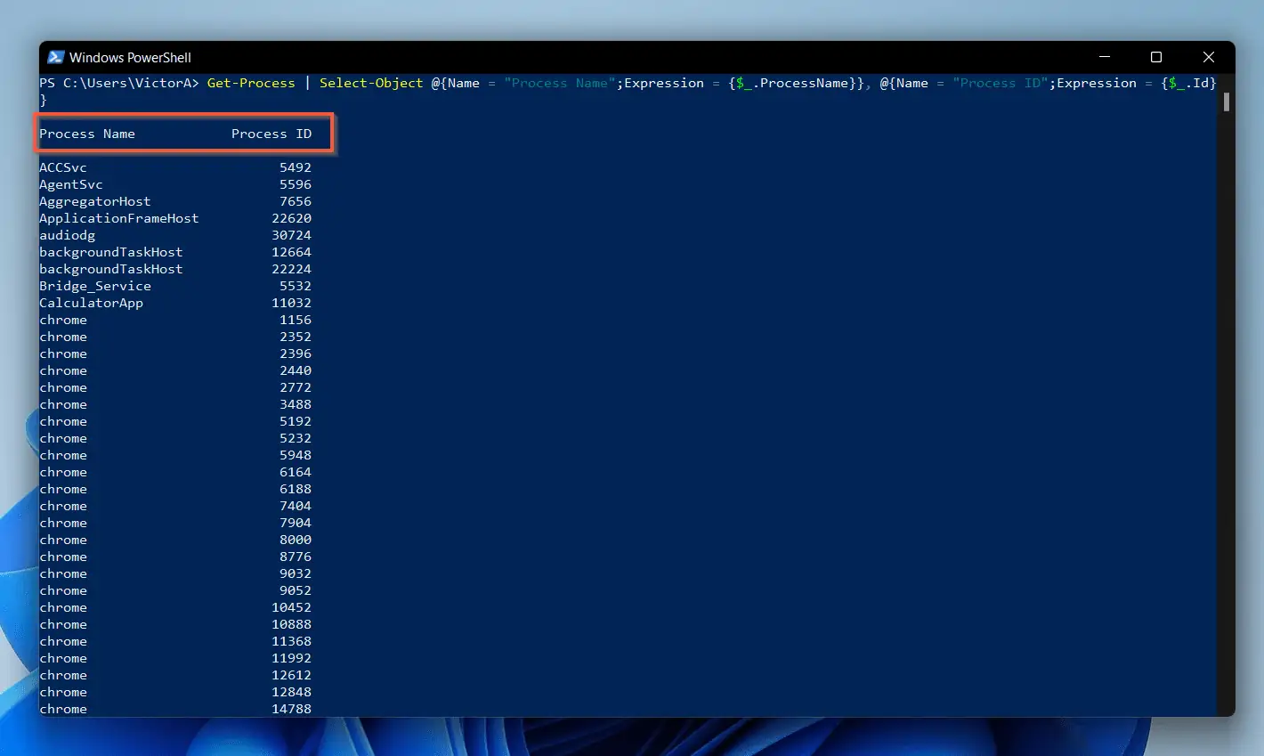 Get-Process | Select-Object @{Name = "Process Name";Expression = {$_.ProcessName}}, @{Name = "Process ID";Expression = {$_.Id}}