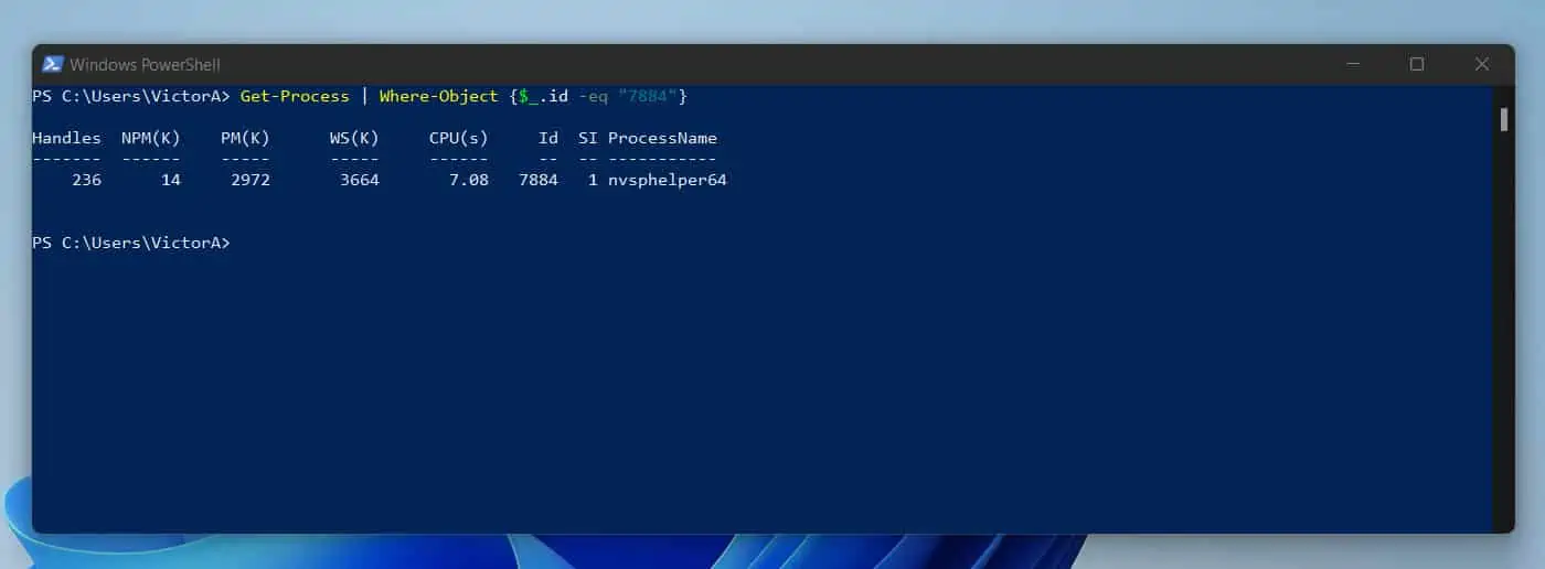 In this example, I will pipe the output of the Get-Process command to the Where-Object. Then, within the Where-Object command, I’ll filter out all other processes and return only the process with ID 7884.