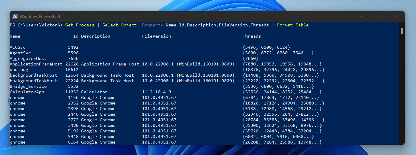 Get-Process | Select-Object -Property Name,Id,Description,FileVersion,Threads | Format-Table