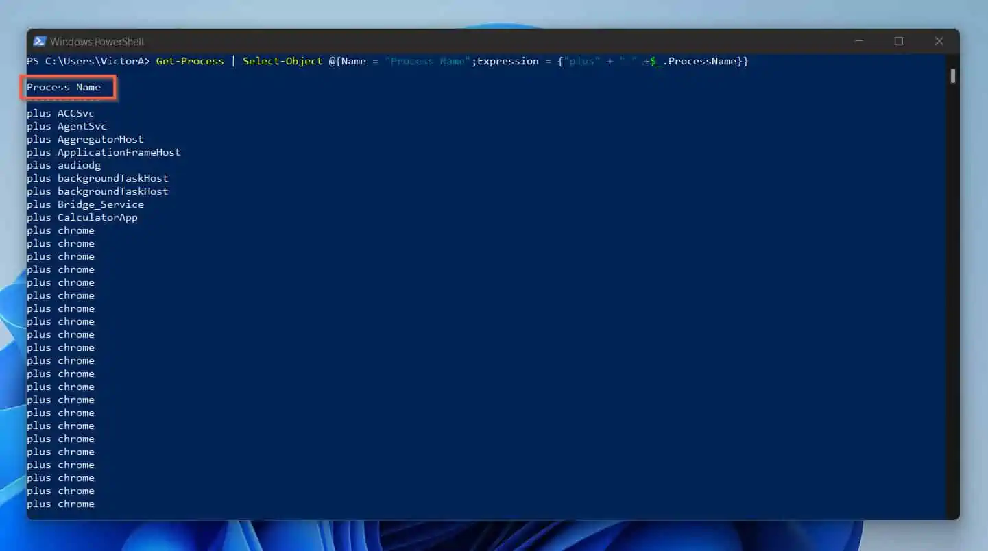 Get-Process | Select-Object {"plus" + " " +$_.ProcessName }