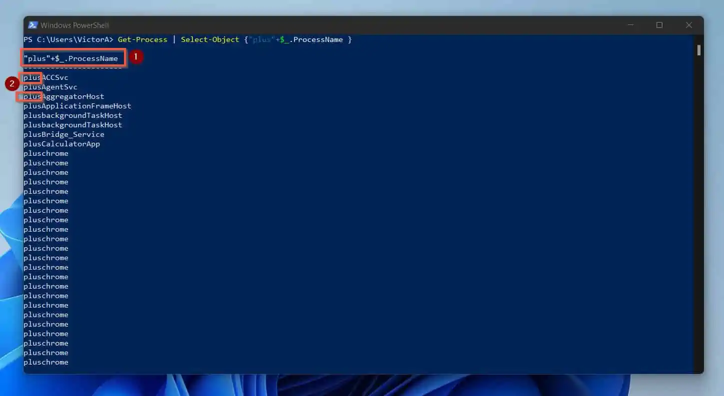 The output now has a space between the string, “plus” and the name of the process. To achieve this, I added double quotes with space (” “) between “plus” and $_.ProcessName.